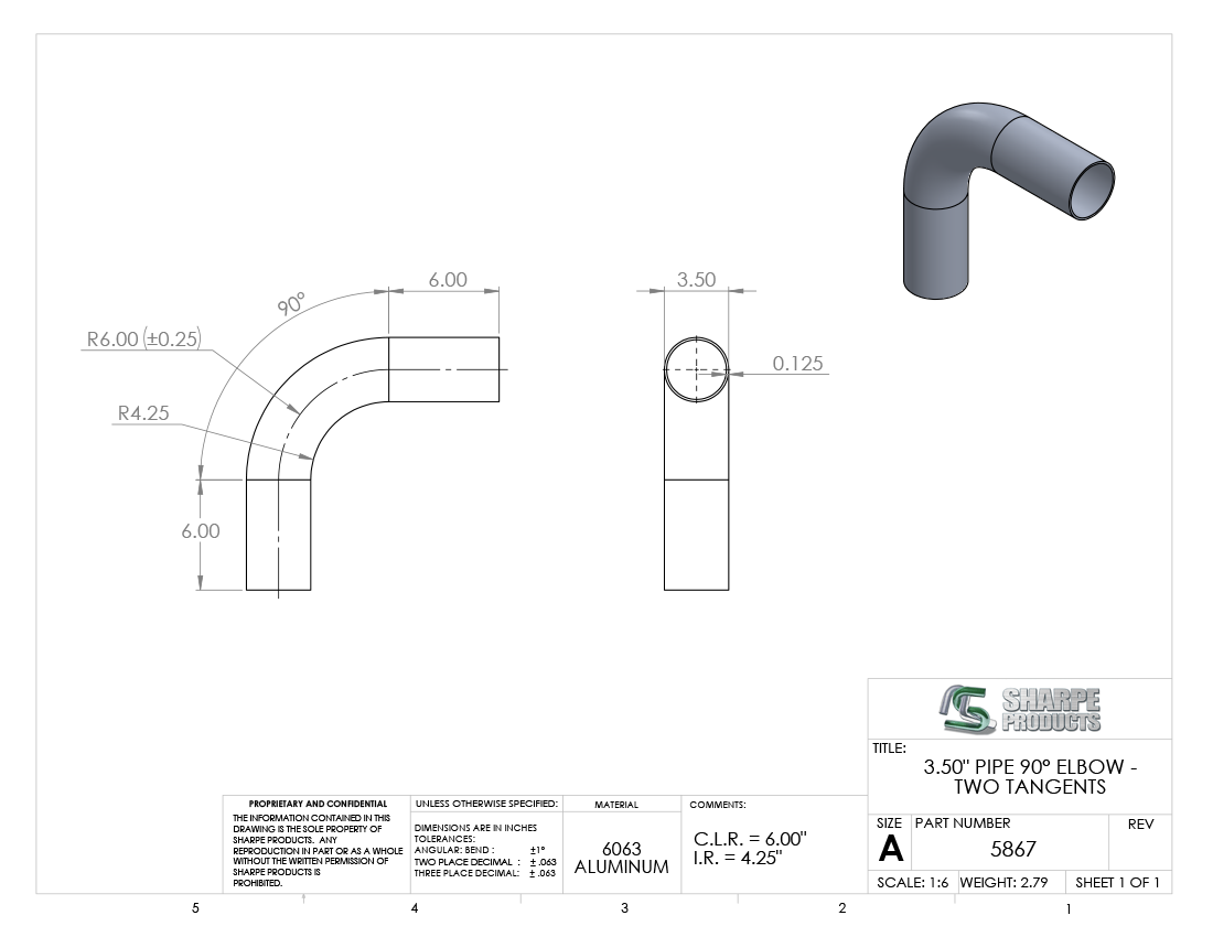 3 1/2 O.D. X .125 WALL 90° ELL 6 C.L.R. W/ (2) 6 TANS., ALUM 6061