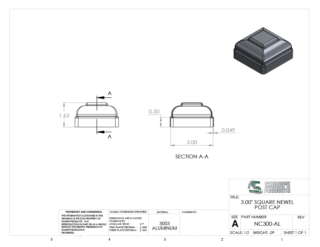 #NC300-AL - ALUMINUM 3" SQ. TUBE NEWEL CAP