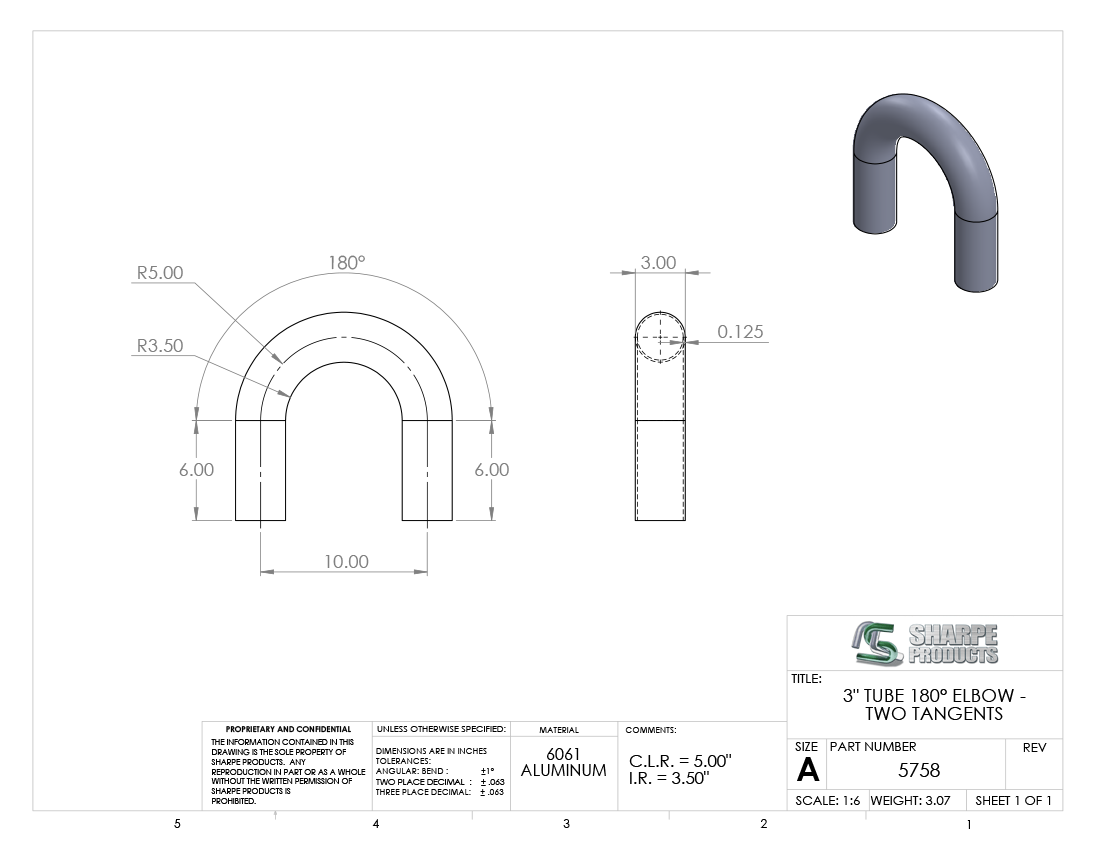 3 O.D. X .125 WALL 180° ELL 5 C.L.R. W/ (2) 6 TANS., ALUM 6061