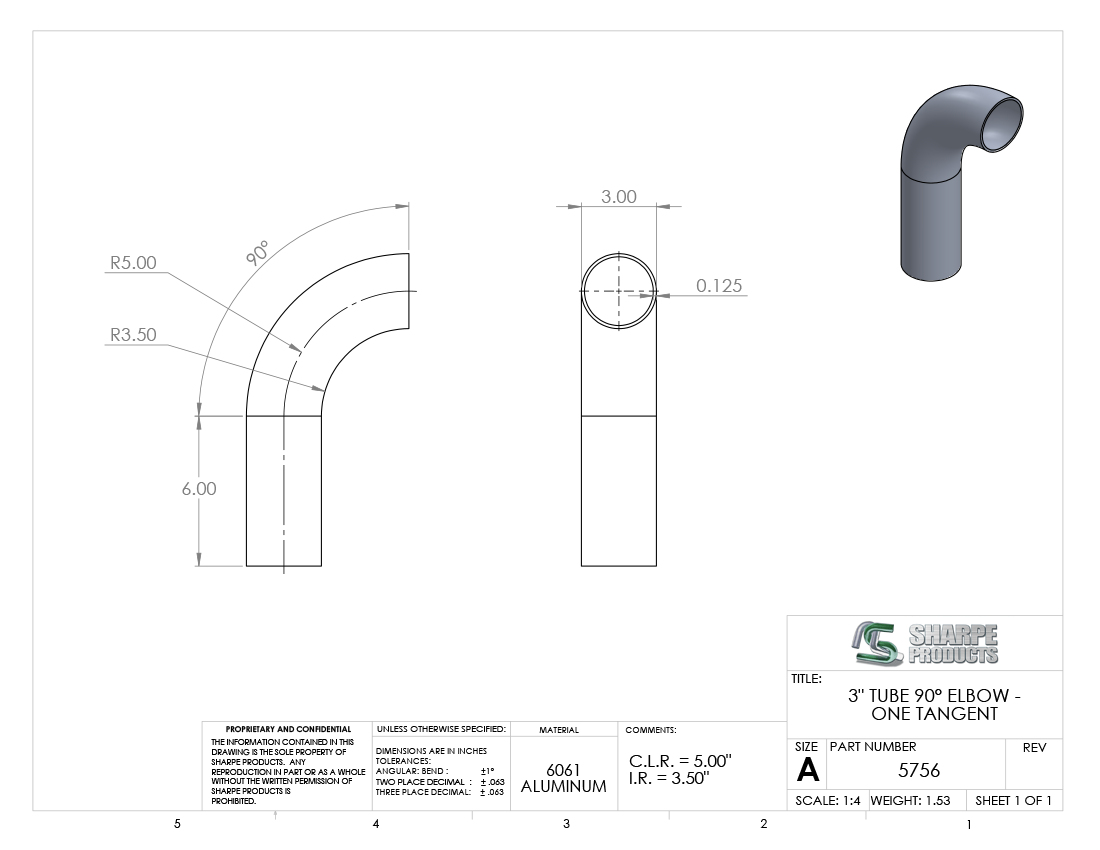 #5756 - ALUMINUM 3" TUBE 90° ELBOW W/ 1 TANGENT 5" C.L.R.