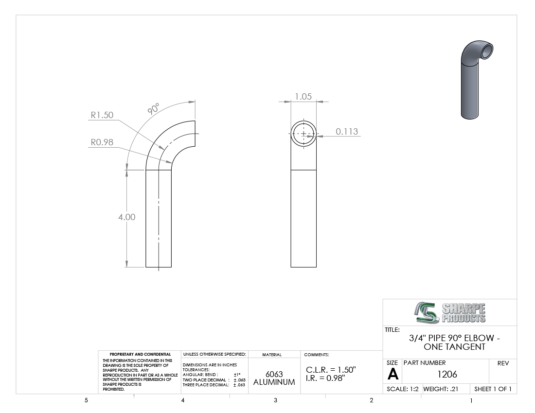 #1206 - ALUMINUM 3/4" PIPE 90° ELBOW W/ 1 TANGENT 1.5" C.L.R.