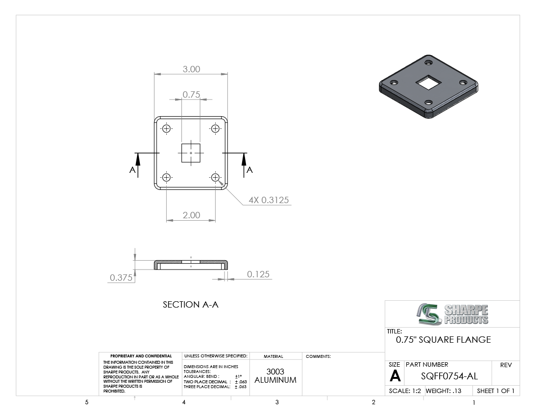 SQ. FLUSH FLANGE, 3/4 W/ (4) HOLES, ALUM 3003