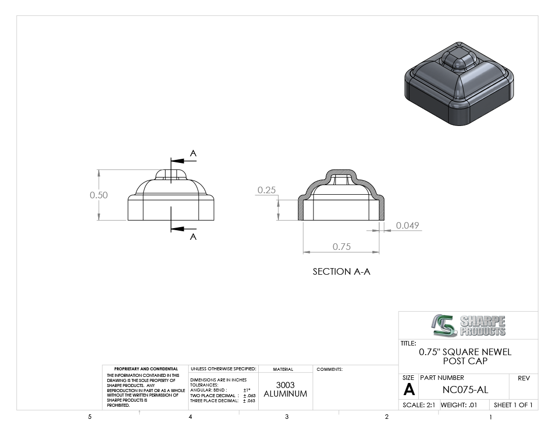 NEWEL CAP, 3/4 X 3/4, ALUM