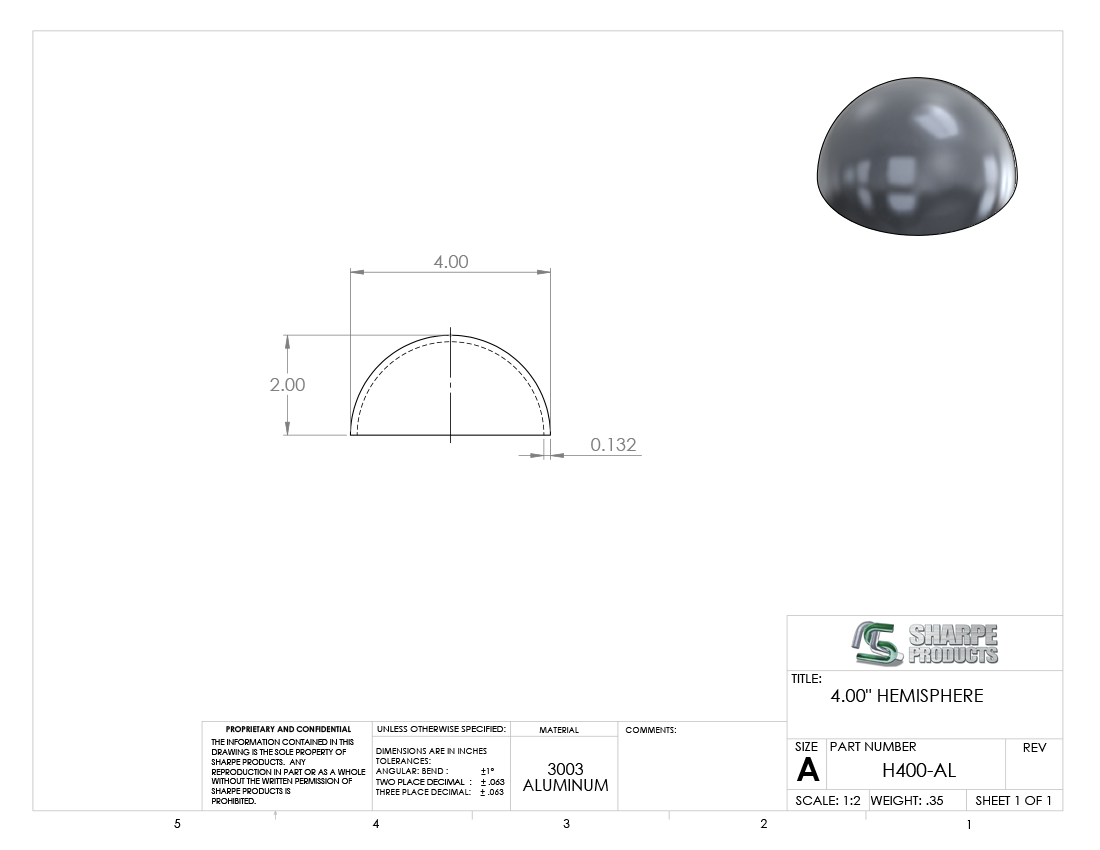 HEMISPHERE ALUM (3003), 4 DIA. X .132 THICK