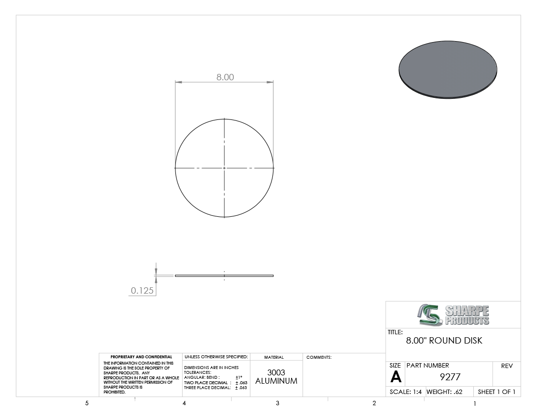 DISK ALUM 3003, 8 DIA. X 1/8 THICK