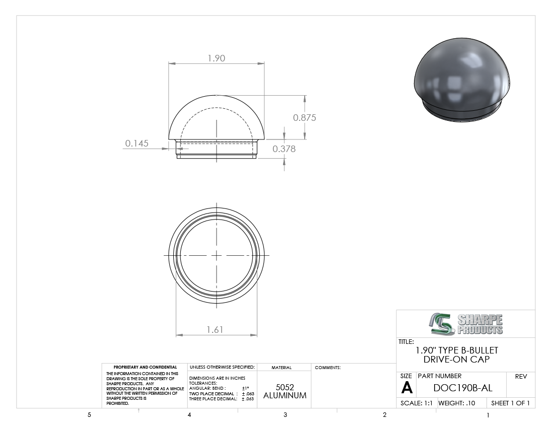 DRIVE ON CAP, 1 1/2 PIPE (1.90 O.D.) SCH 40 TYPE B, ALUM (5052)