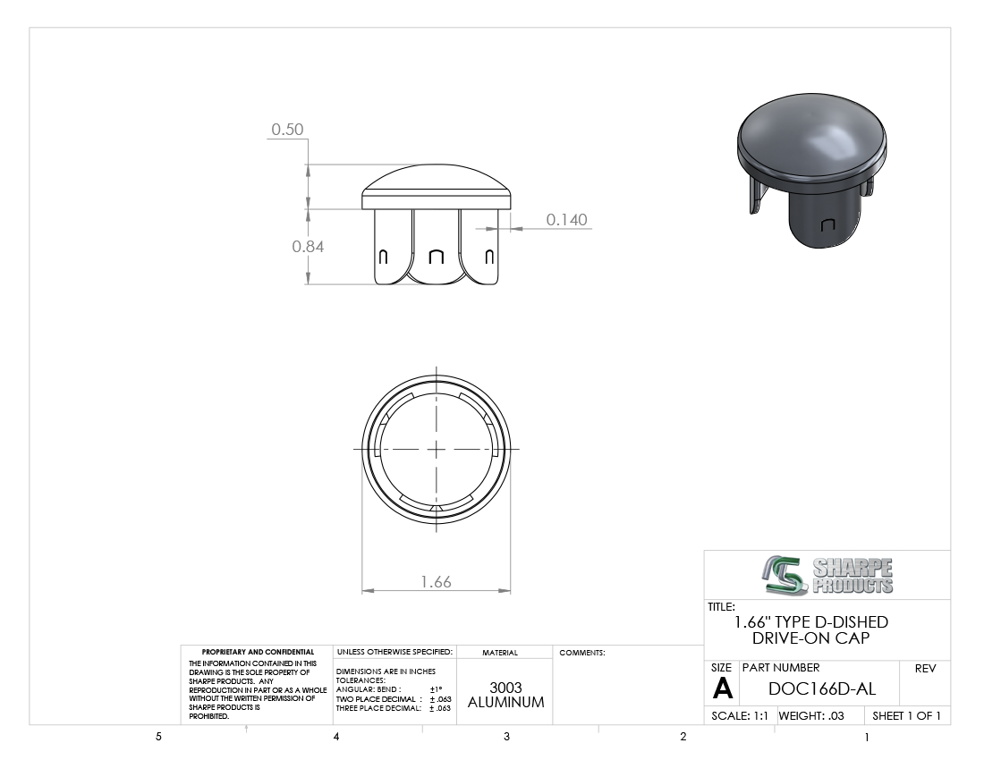 DRIVE ON CAP DISHED, 1 1/4 SCH 40 (1.66 O.D.) ALUM W/ #4 SATIN