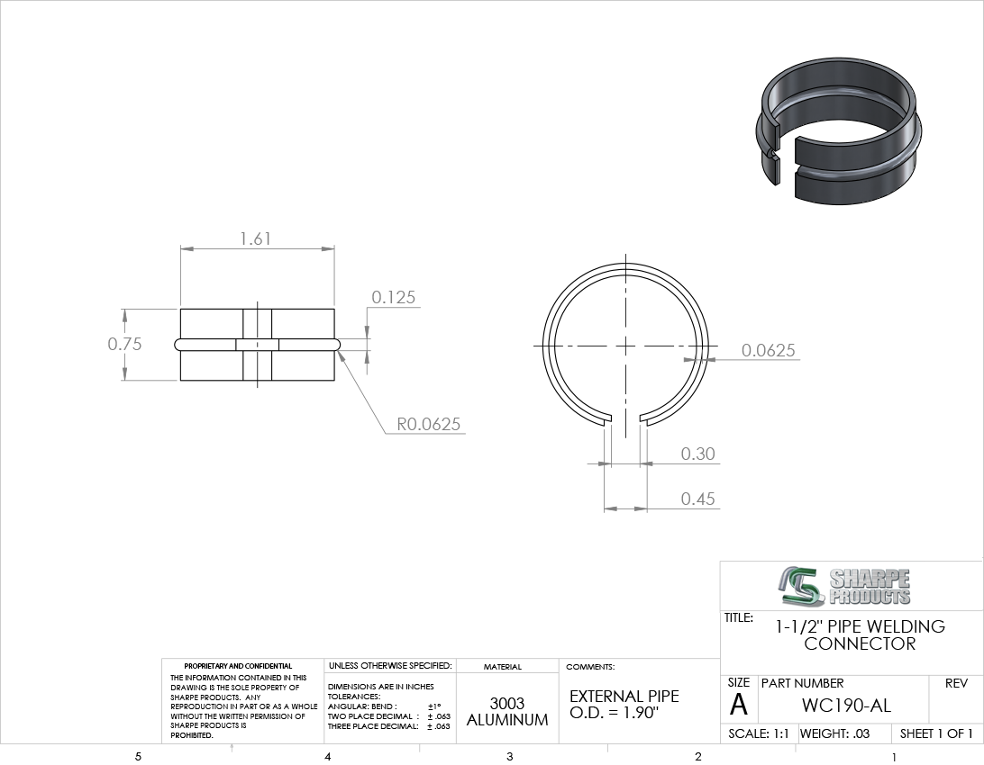 WELD CONNECTOR FOR 1 1/2 SCH 40 (1.90 O.D. X .145 WALL), ALUM 3003