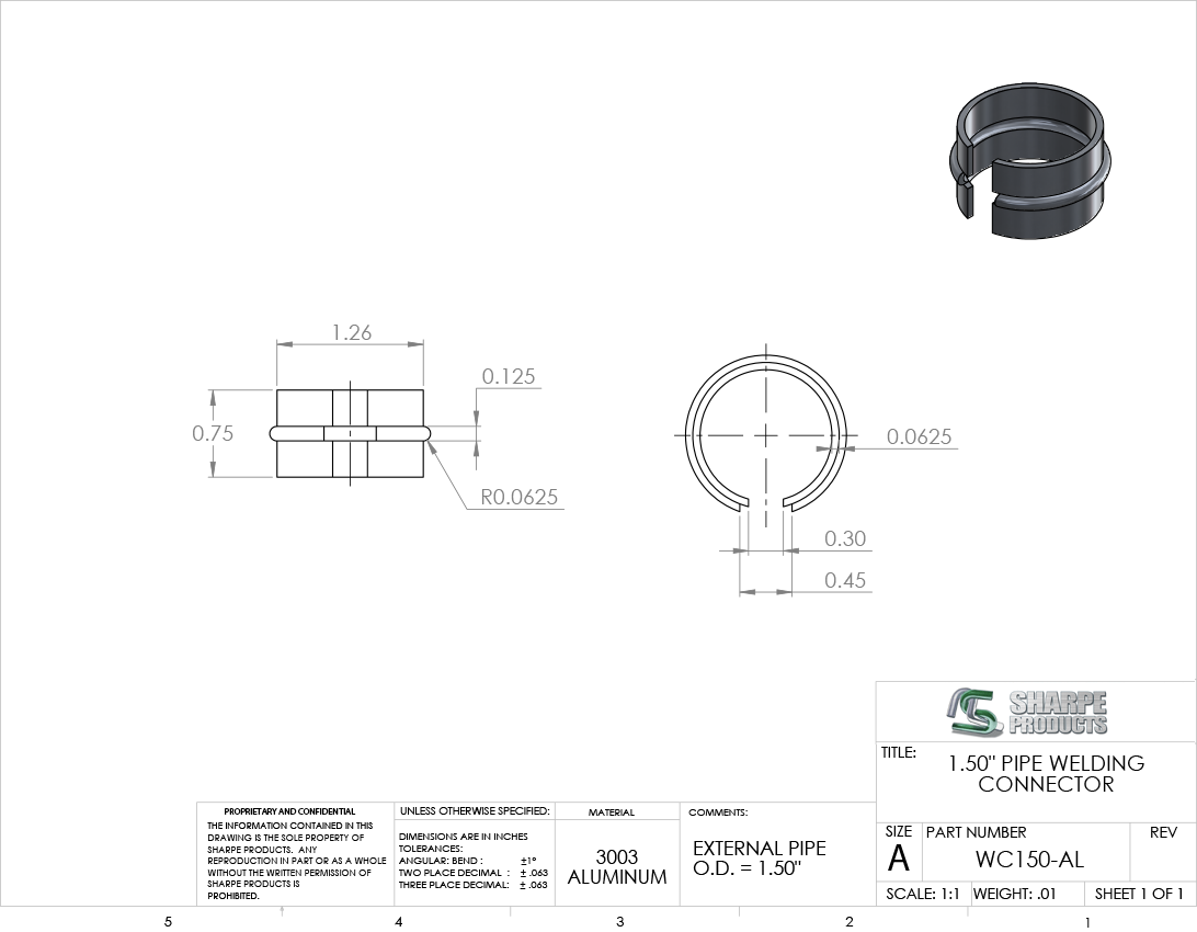 WELD CONNECTOR, 1 1/2 O.D. X .125 WALL, ALUM