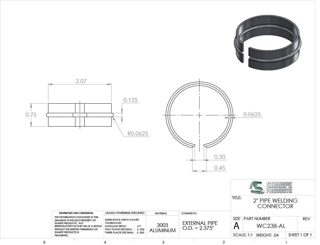 WELD CONNECTOR FOR 2 SCH 40 (2.375 O.D. X .154 WALL), ALUM 3003