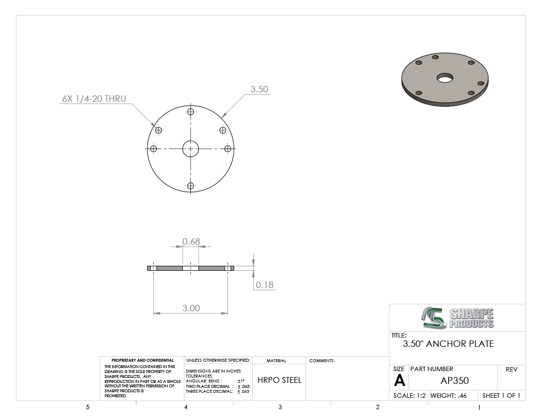 ANCHOR PLATE, 3 1/2 DIA. X 3/16 THICK W/HOLES & SCREWS W/ (6) 1/4-20 X 3/8 THREADED HOLES, STEEL