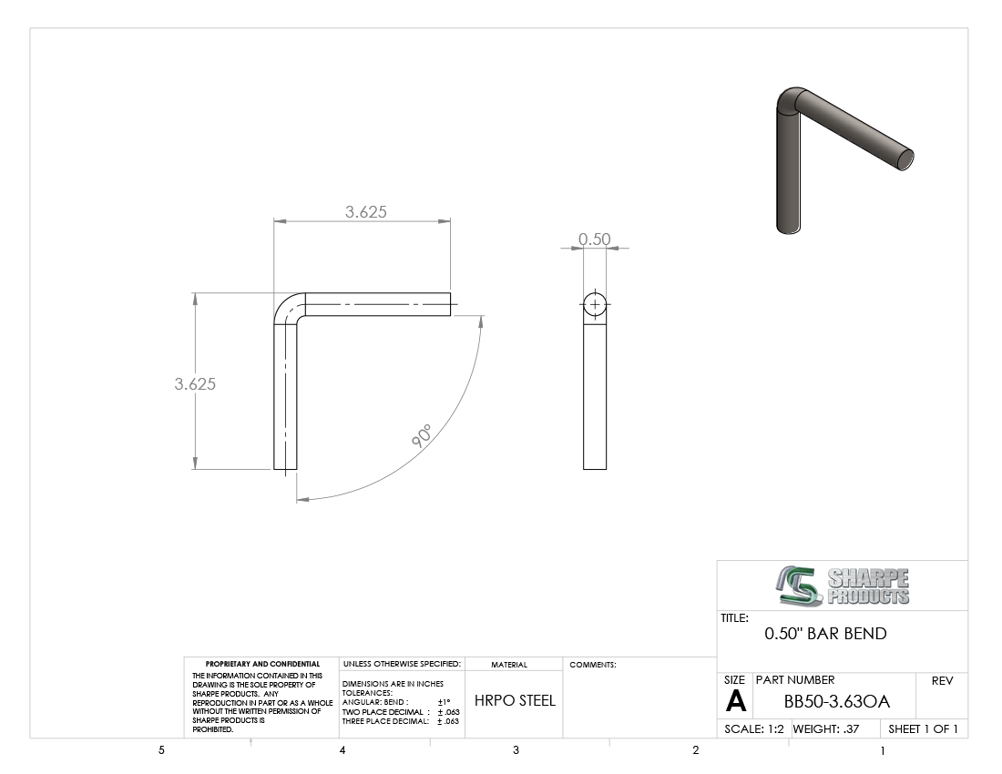 BAR BEND, 1/2 DIA. ROUND, STEEL BENT 90° ON A 7/8 C.L.R. W/ (2) 3.63 MINIMUM O.A. LEGS, UNTRIMMED