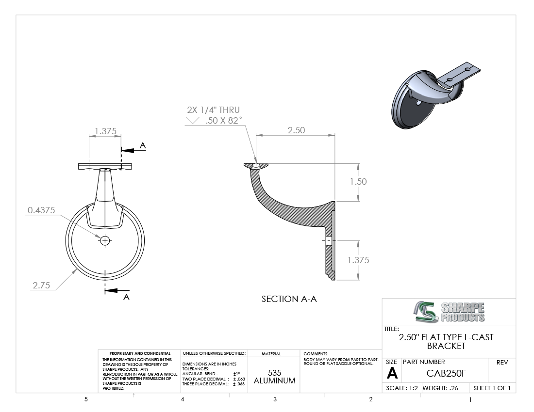 #CAB250F - CAST ALUMINUM BRACKET, 2 1/2" C.L., FLAT SADDLE