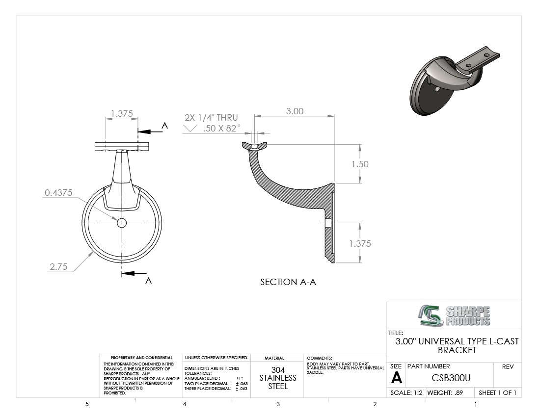 #CSB300U - CAST STAINLESS BRACKET, 3" C.L., UNIVERSAL SADDLE