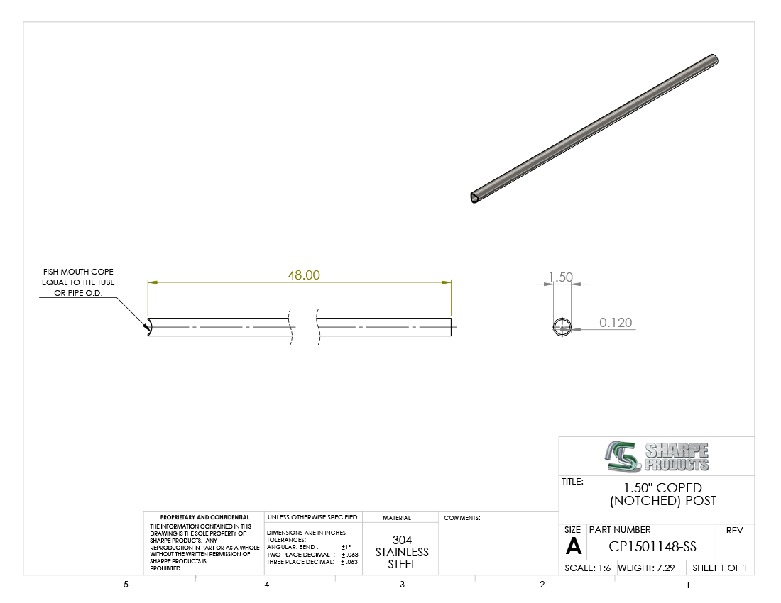 #CP1501148-SS - COPED POST S/S 304, 1 1/2" O.D. X .120 WALL (11 GAGE)