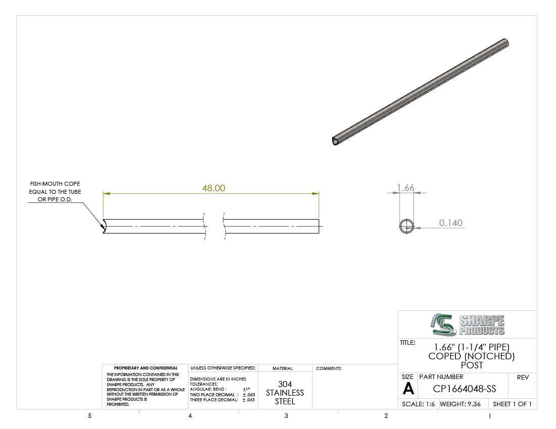 #CP1664048-SS - COPED POST S/S 304, 1 1/4" SCH 40 (1.66" O.D.)