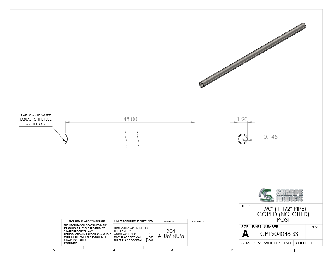 #CP1904048-SS - COPED POST S/S 304, 1 1/2" SCH 40 (1.90" O.D.)