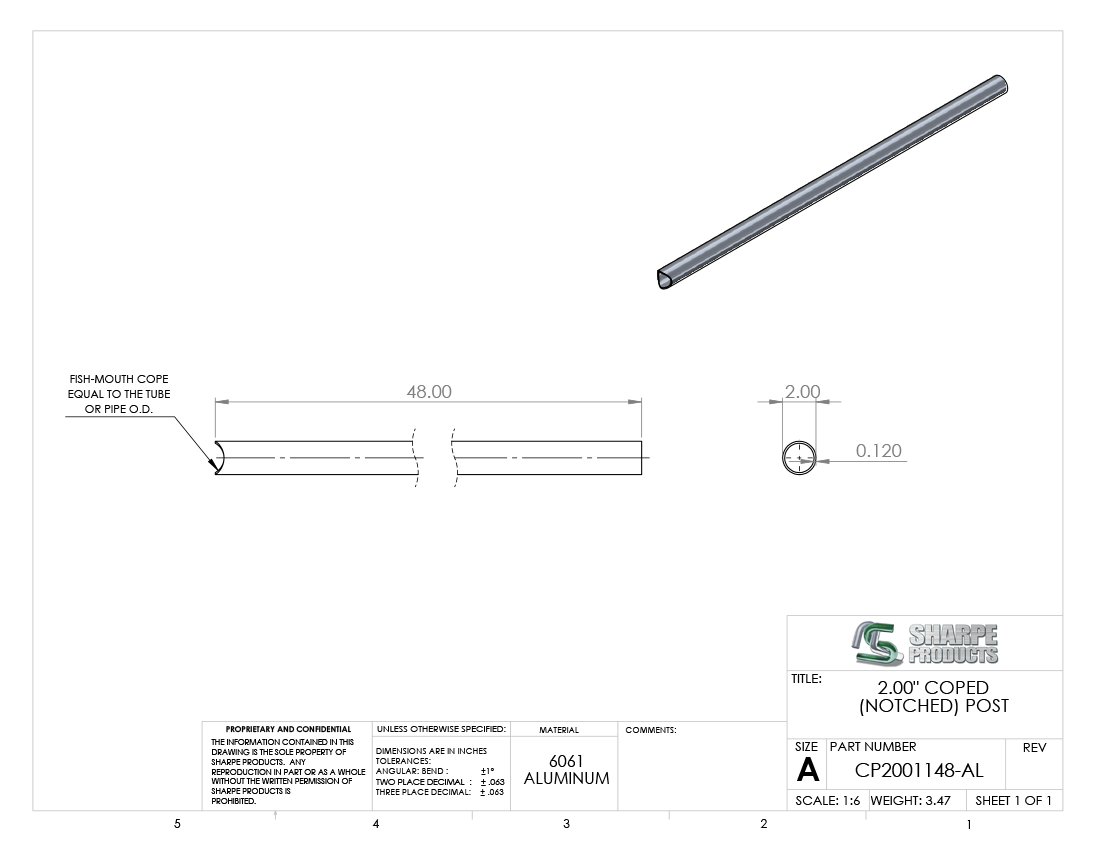 COPED POST ALUM 6061, 2 O.D. (2 O.D.) @ 48 LONG NOTCHED ON ONE END