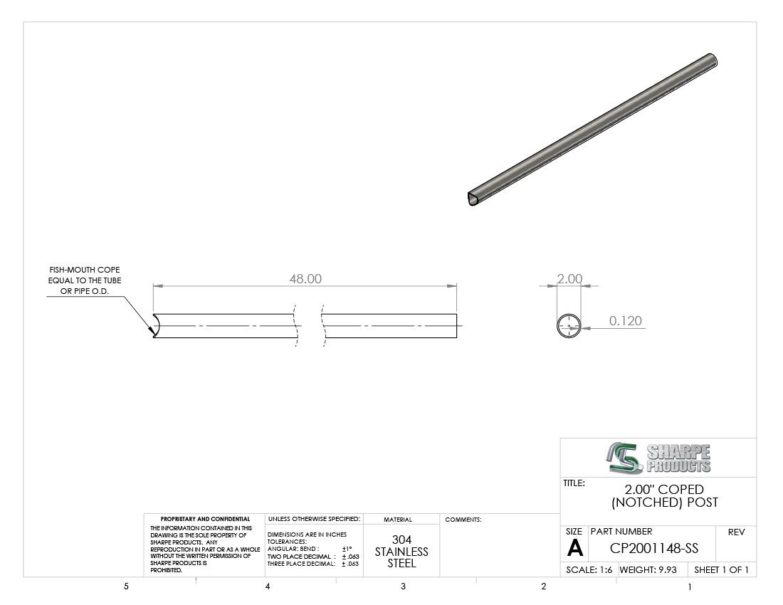 COPED POST S/S 304, 2 O.D. X .120 WALL (11 GAGE) @ 48 LONG NOTCHED ON ONE END FOR 2 O.D. TUBE **PRE-POLISHED #4, NO TOUCH UP