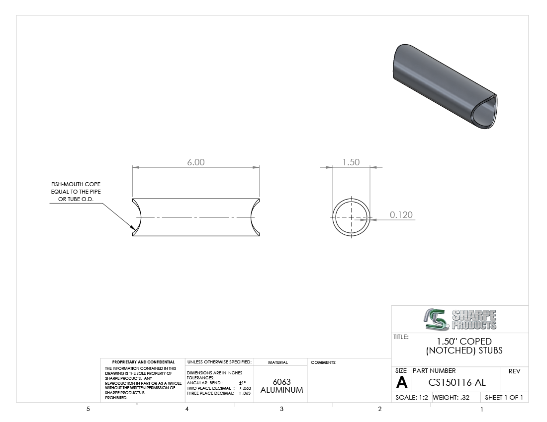 #CS150116-AL - COPED STUB ALUM 6061, 1 1/2" O.D. X .125 WALL