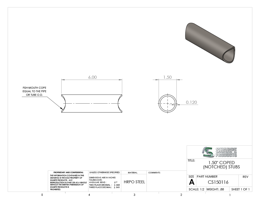 #CS150116 - COPED STUB STEEL, 1 1/2" O.D. X .120 WALL (11 GAGE)