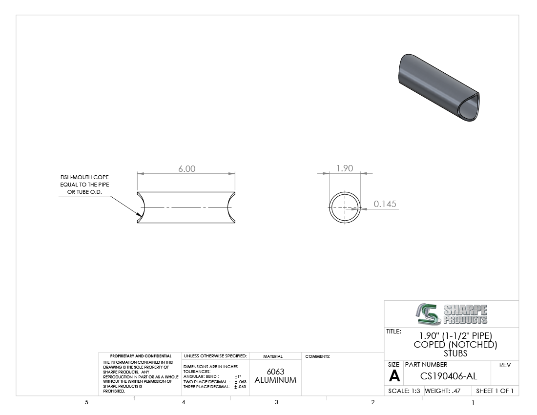 COPED STUB ALUM 6063, 1 1/2 SCH 40 (1.90 O.D.) @ 6 LONG NOTCHTED ON BOTH ENDS **MILL FINISH
