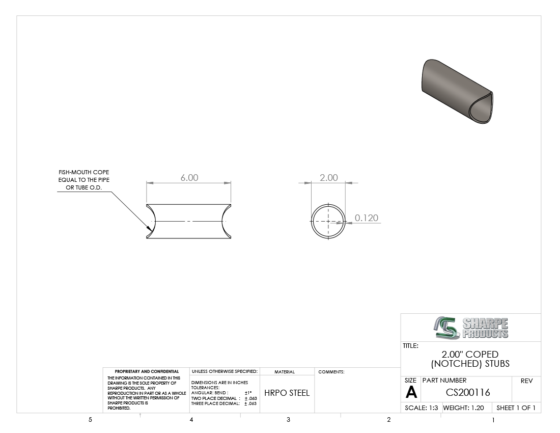 COPED STUB STEEL, 2 O.D. X .120 WALL (11 GAGE) @ 6 LONG NOTCHED ON BOTH ENDS FOR 2 O.D. TUBE