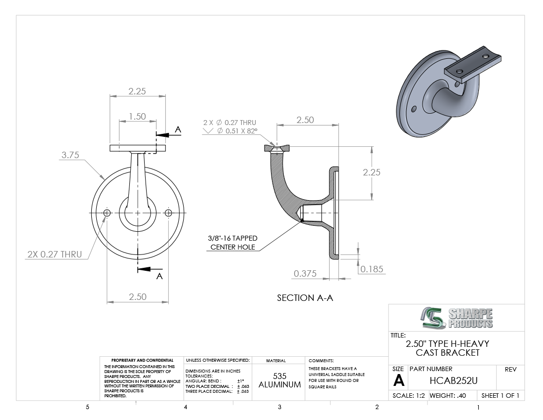 HVY CAST ALUM BRKT, 2 1/2 C.L. W/ (2) HOLES, UNIV SADDLE & #4 SATIN