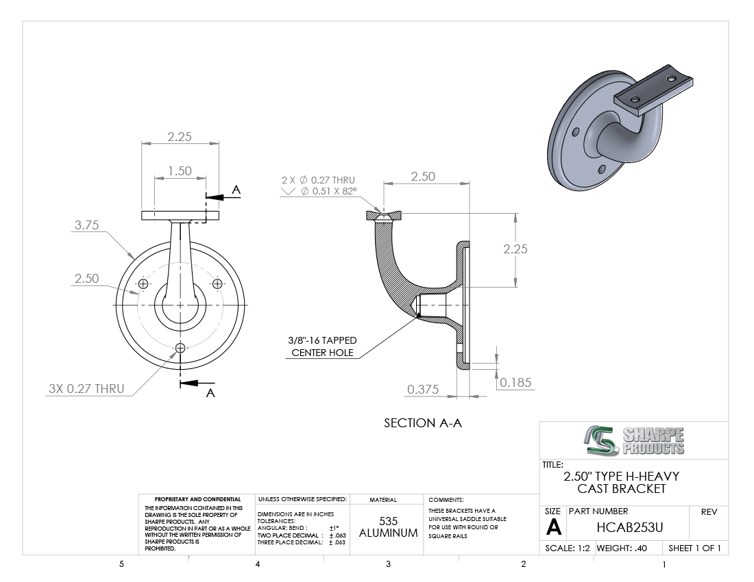 HVY CAST ALUM BRKT, 2 1/2 C.L.R. W/ (3) HOLES, UNIV. SADDLE & #4 SATIN