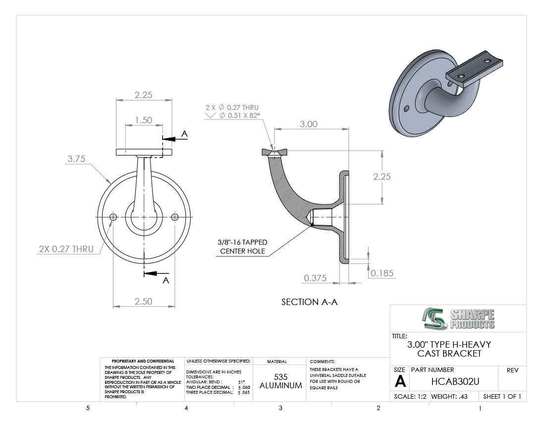 HVY CAST ALUM BRKT, 3 C.L. W/ (2) HOLES, UNIV. SADDLE & #4 SATIN