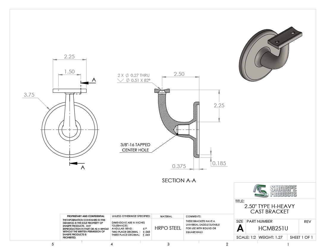 HVY CAST MALL BRKT, 2 1/2 C.L. W/ (1) CONCEALED HOLE & UNIV. SADDLE