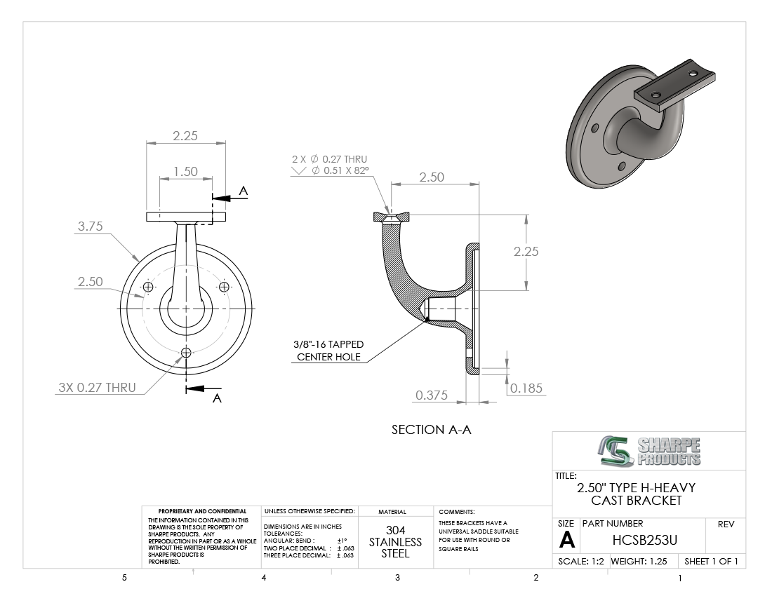 HVY CAST S/S 304 BRKT, 2 1/2 C.L. W/ (3) HOLES, UNIV. SADDLE & #4 SATIN FINISH