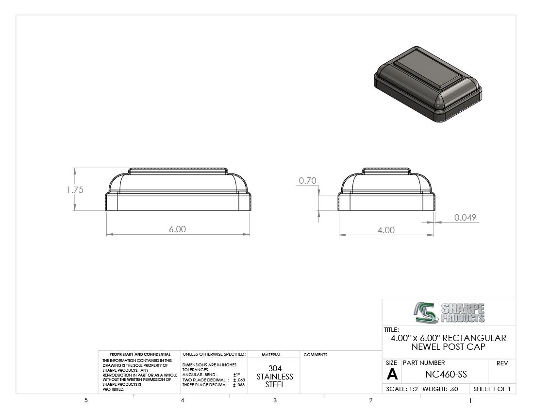 NEWEL CAP, 4"x6", STAINLESS STEEL