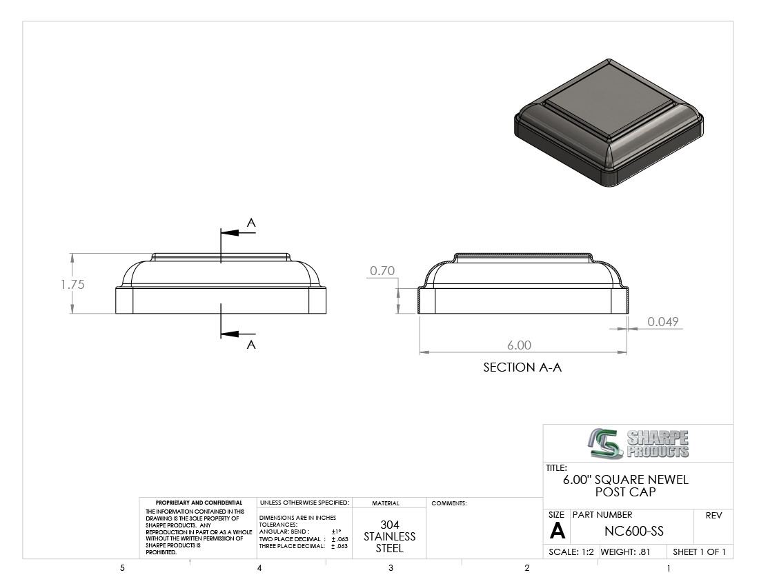 NEWEL CAP, 6 X 6, S/S 304 **MILL FINISH