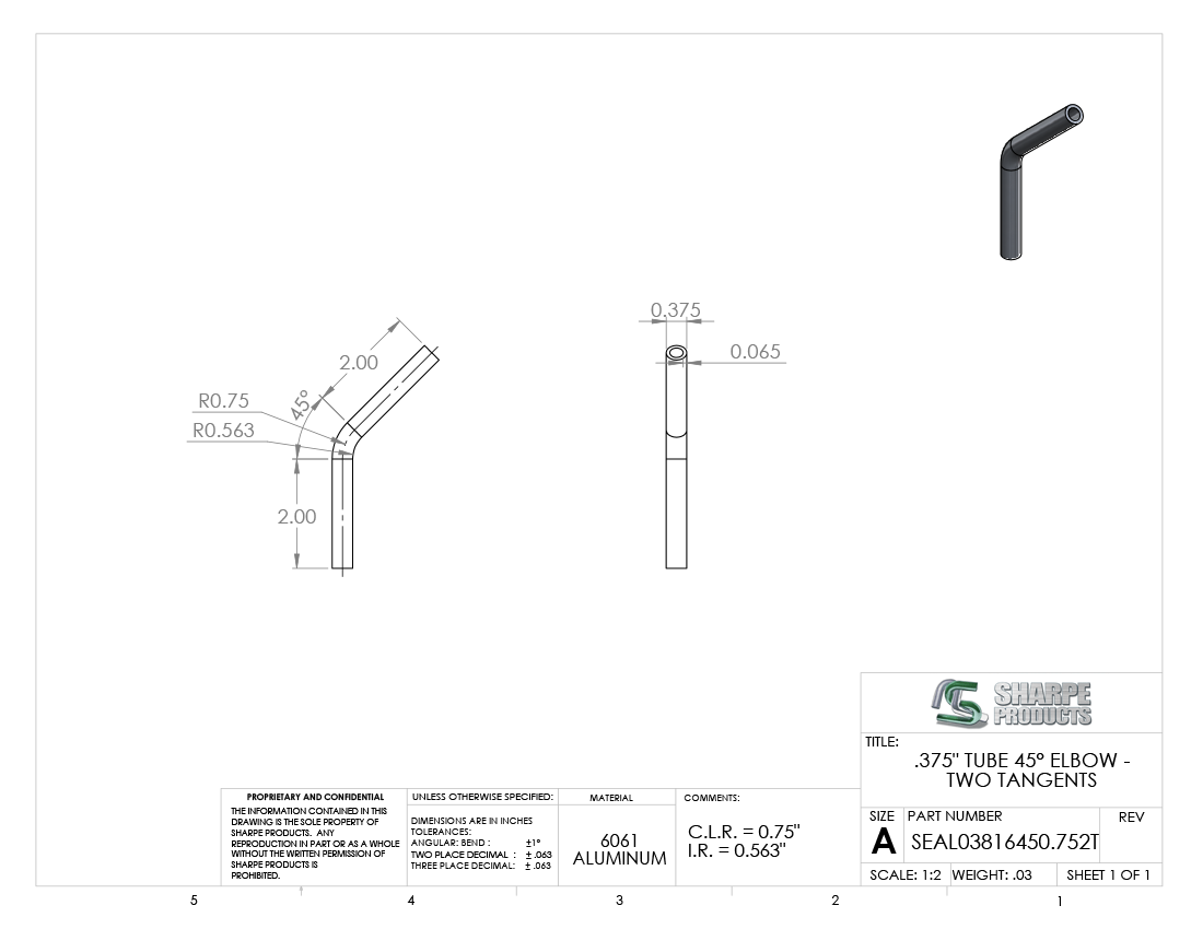 3/8 O.D. X .065 WALL 45° ELL 3/4 C.L.R. W/ (2) 2 MINIMUM TANS., ALUM 6061