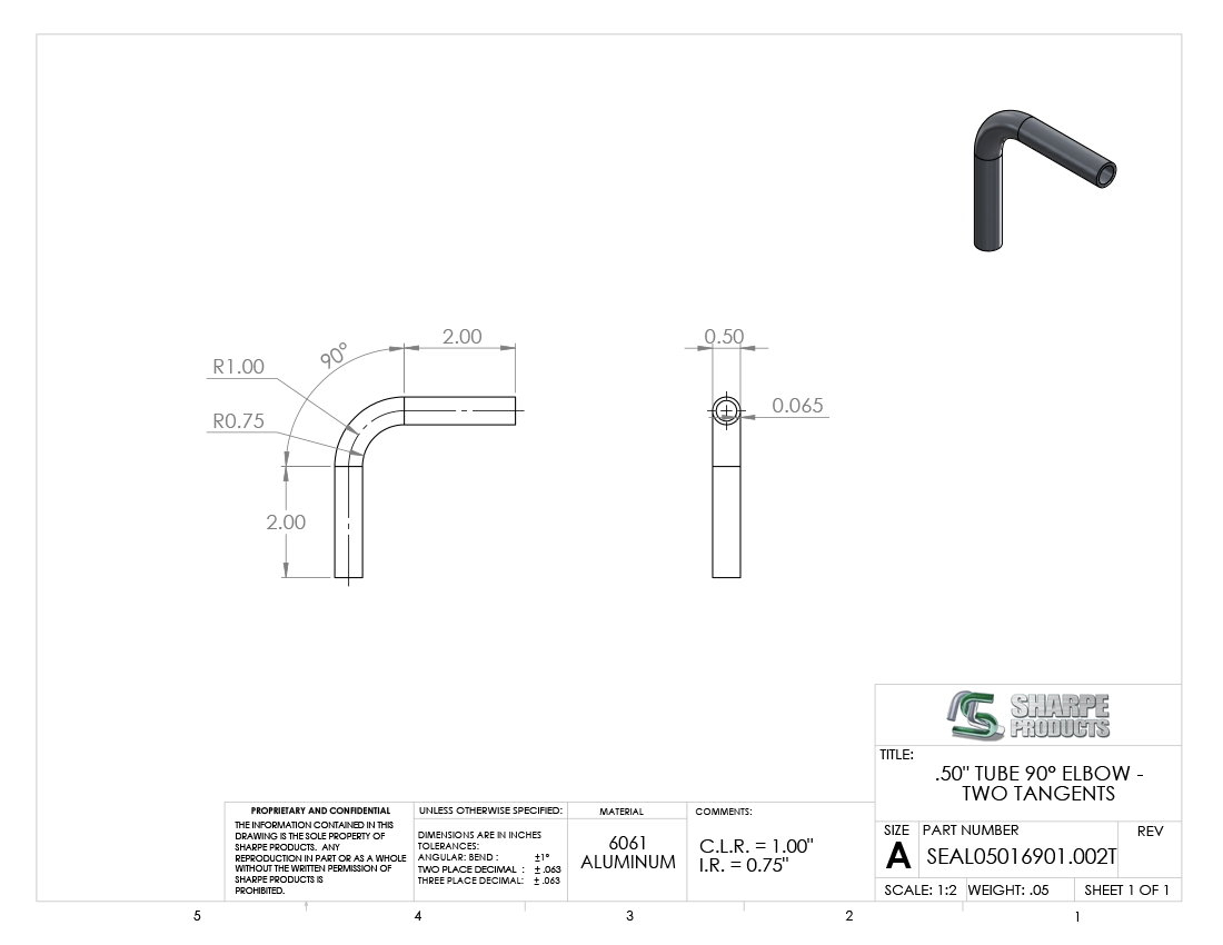 1 O.D. X .065 WALL 90° ELL 1 C.L.R. W/ (2) 2 MINIMUM TANS., ALUM 6061
