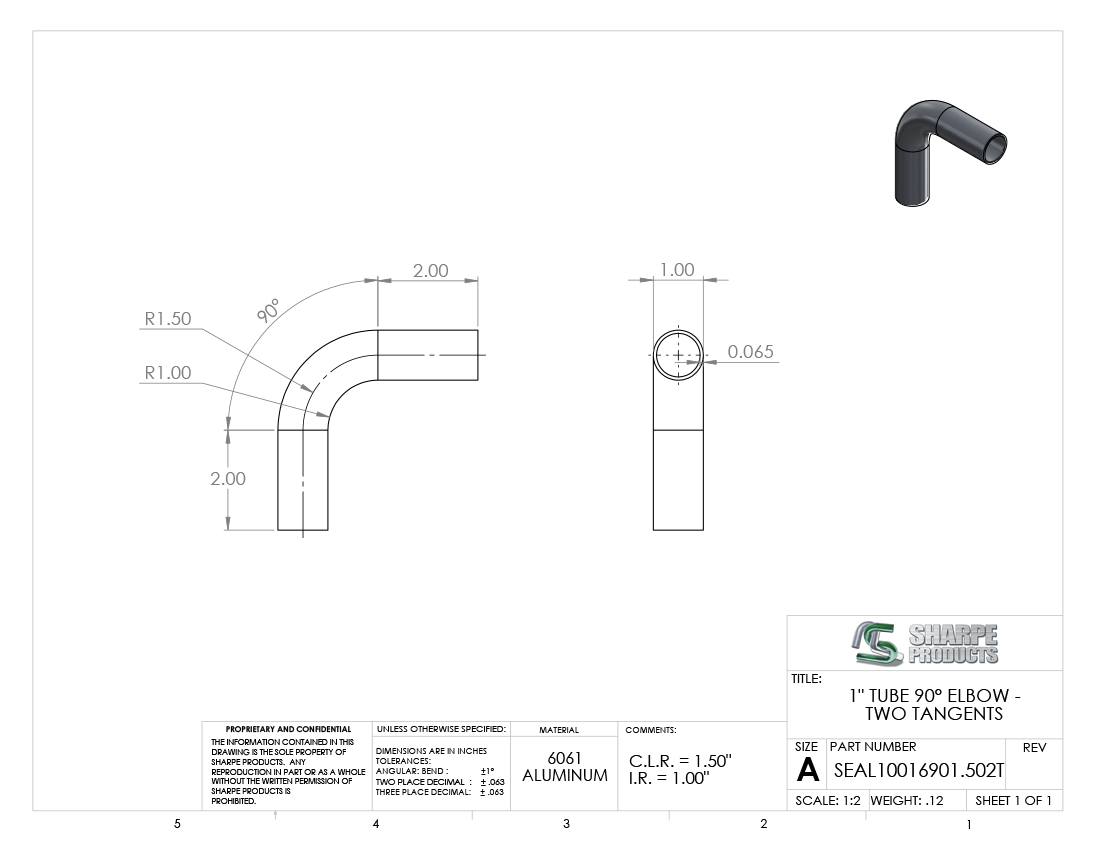 1 O.D. X .065 WALL 90° ELL ELL 1 1/2 C.L.R. W/ (2) 2 MINIMUM TANS., ALUM 6061