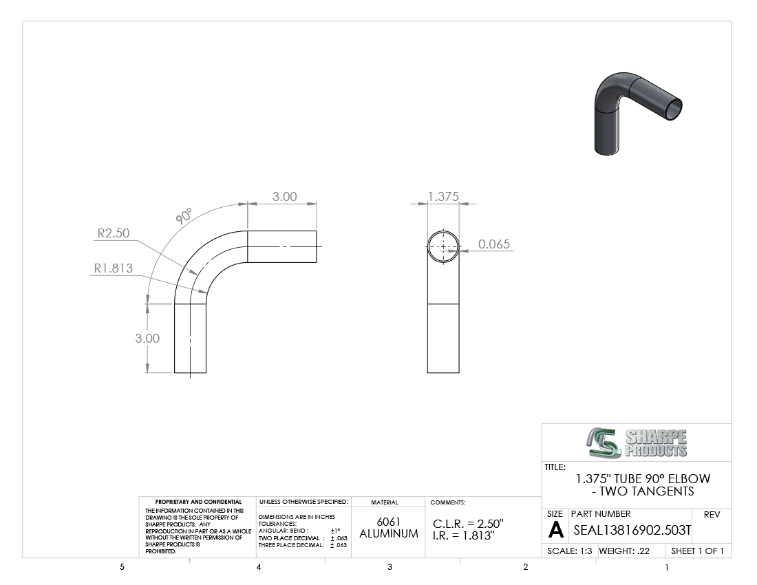1 3/8 O.D. X .065 WALL 90° ELL 2 1/2 C.L.R. W/ (2) 3 MINIMUM TANS., ALUM 6061