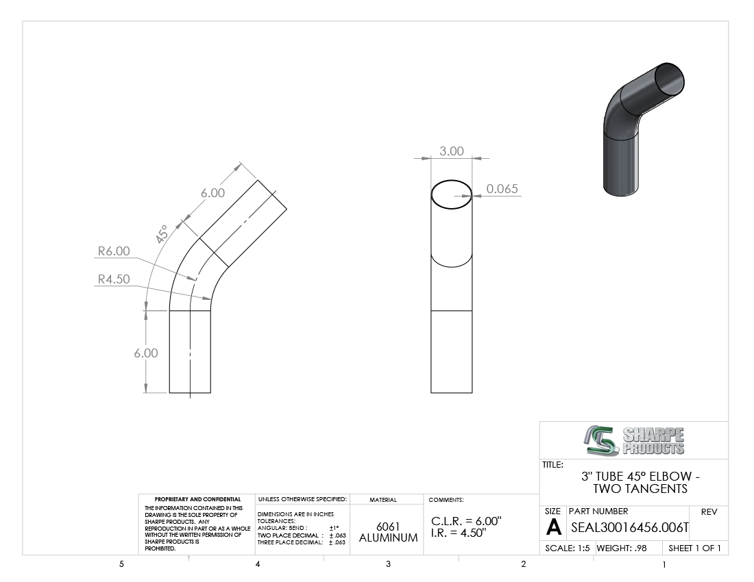 3 O.D. X .065 WALL 45° ELL 6 C.L.R. W/ (2) 6 MINIMUM TANS., ALUM 6061