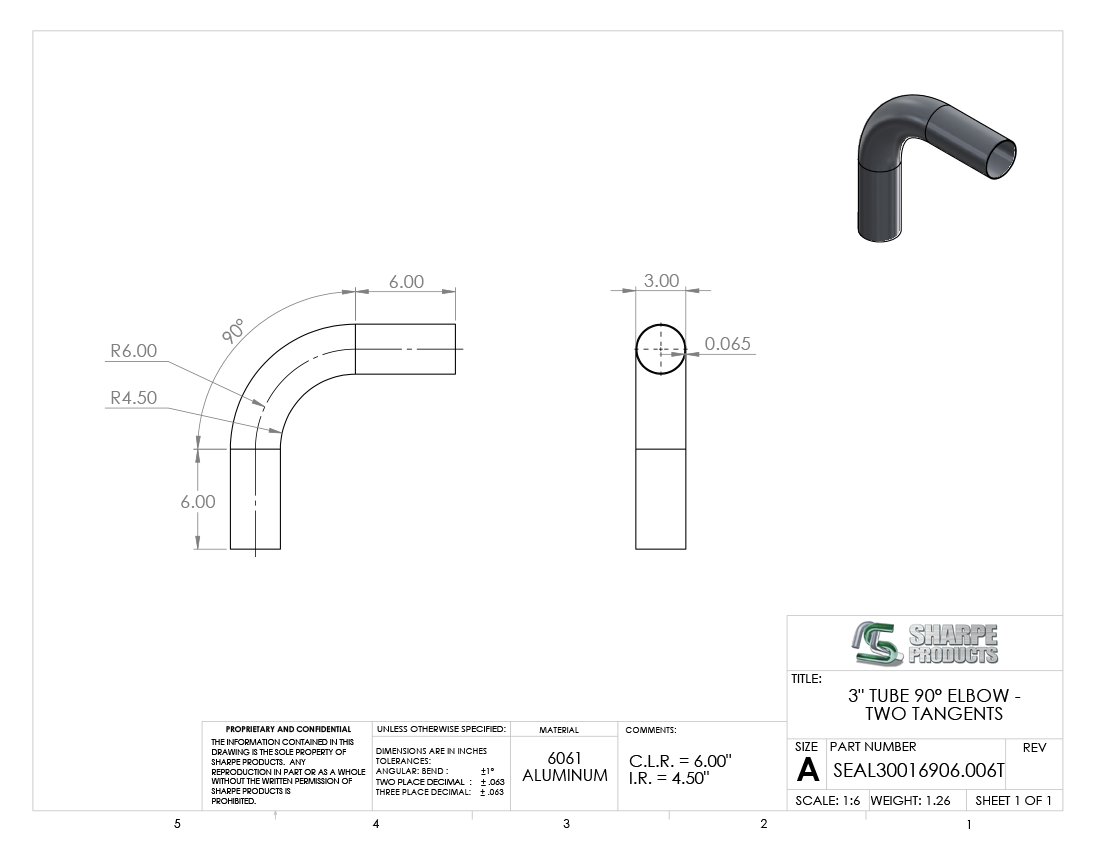 3 O.D. X .065 WALL 90° ELL 6 C.L.R. W/ (2) 6 MINIMUM TANS., ALUM 6061