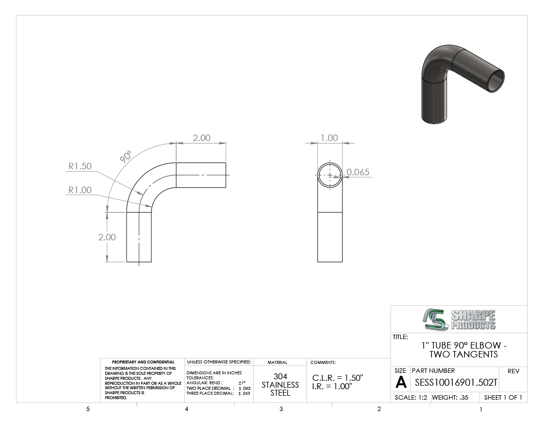 1 O.D. X .065 WALL (16 GAGE) 90° ELL 1 1/2 C.L.R. W/ (2) 2 MINIMUM TANS., S/S 304/304L **MILL FINISH