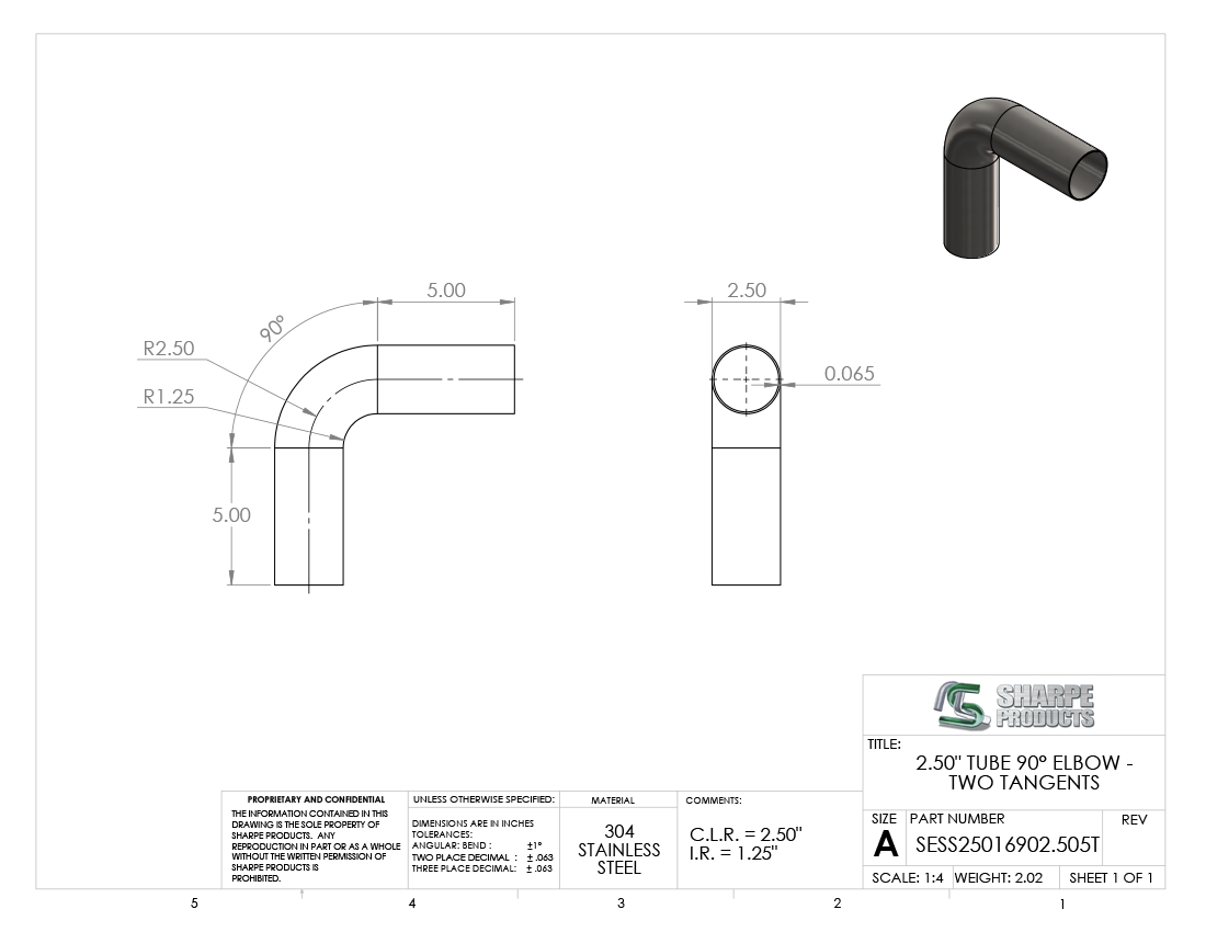 2 1/2 O.D. X .065 WALL (16 GAGE) 90° ELL 2 1/2 C.L.R. W/ (2) 5 MINIMUM TANS., S/S 304 **MILL FINISH