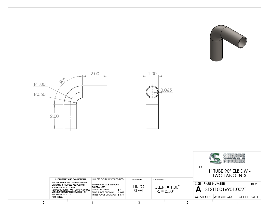 1 O.D. X .065 WALL (16 GAGE) 90° ELL 1 C.L.R. W/ (2) 2 MINIMUM TANS., UNTRIMMED STEEL