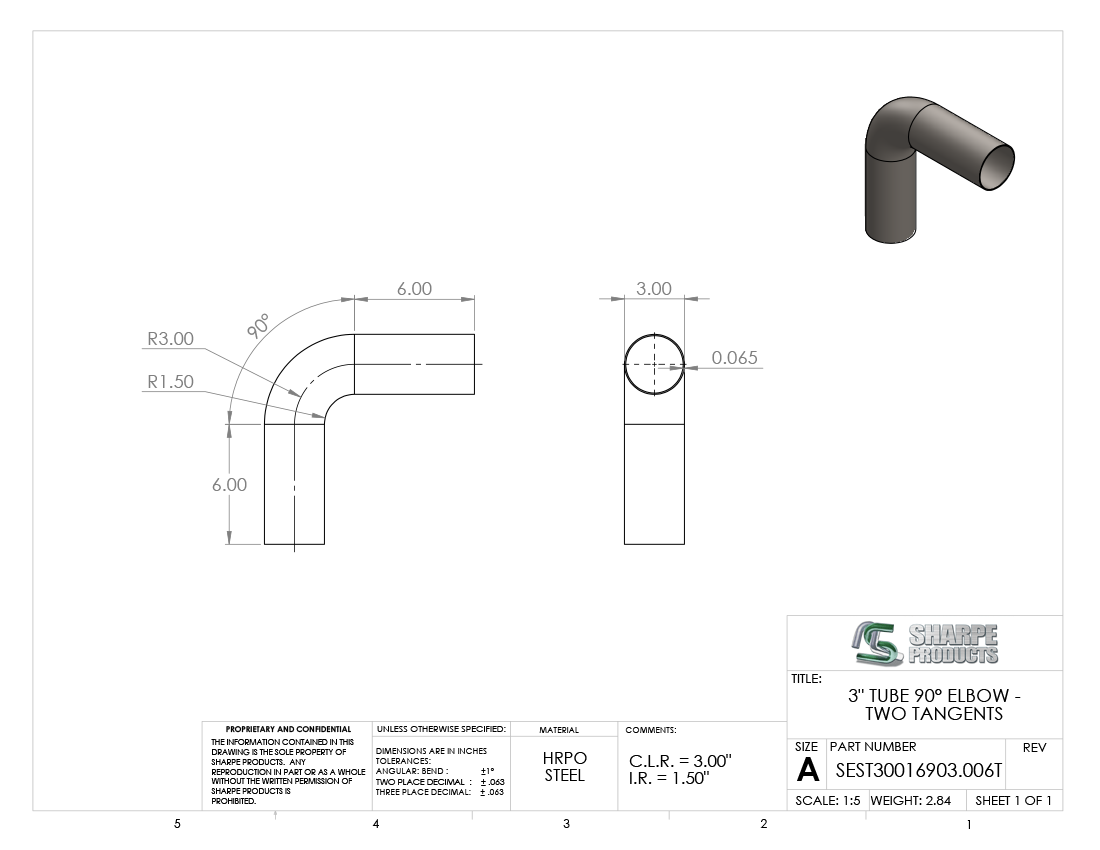 3 O.D. X .065 WALL (16 GAGE) 90° ELL 3 C.L.R. W/ (2) 6 MINIMUM TANS., STEEL