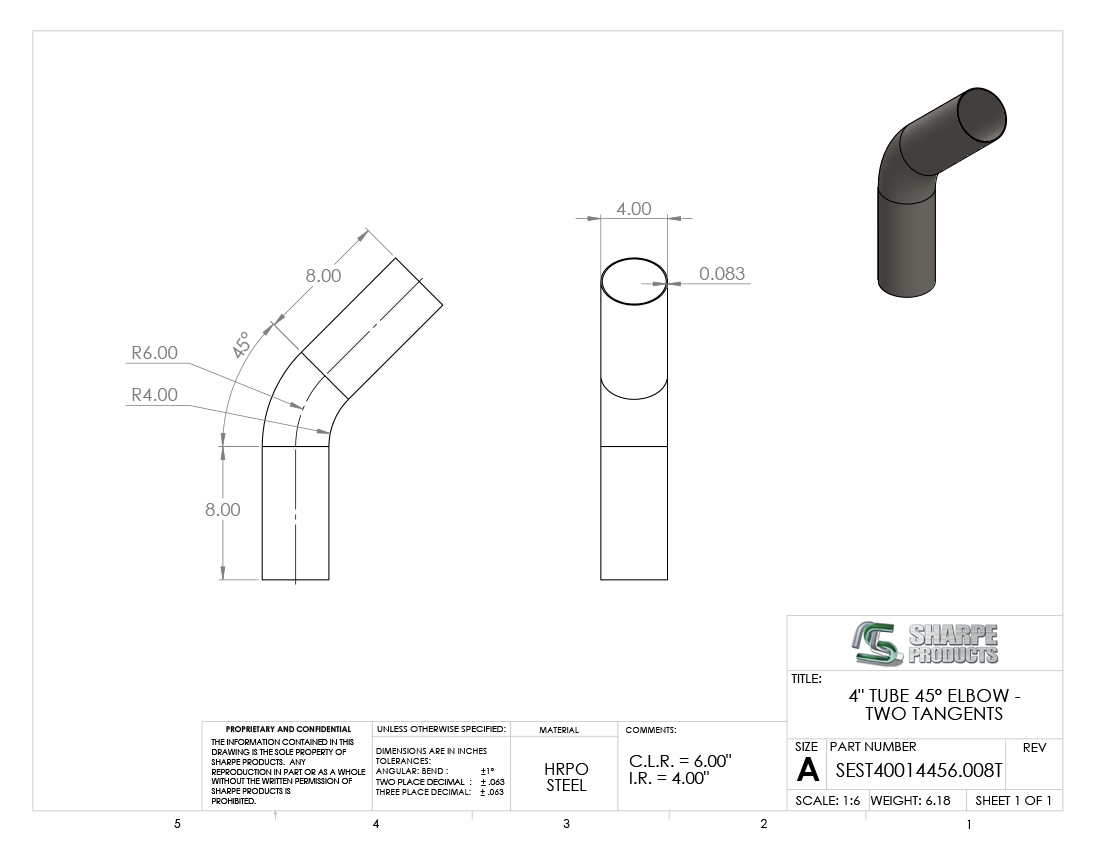4 O.D. X .083 WALL (14 GAGE) 45° ELL 6 C.L.R. W/ (2) 8 MINIMUM TANS., STEEL