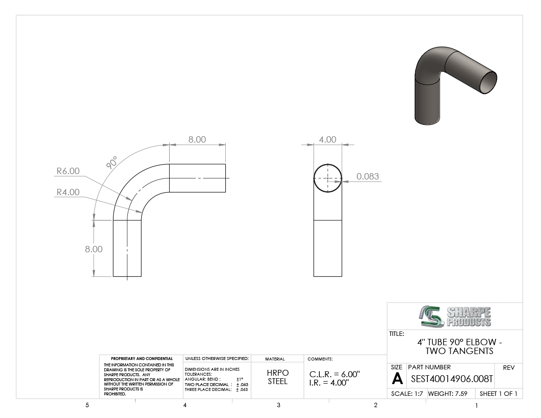 4 O.D. X .083 WALL (14 GAGE) 90° ELL 6 C.L.R. W/ (2) 8 MINIMUM TANS., STEEL
