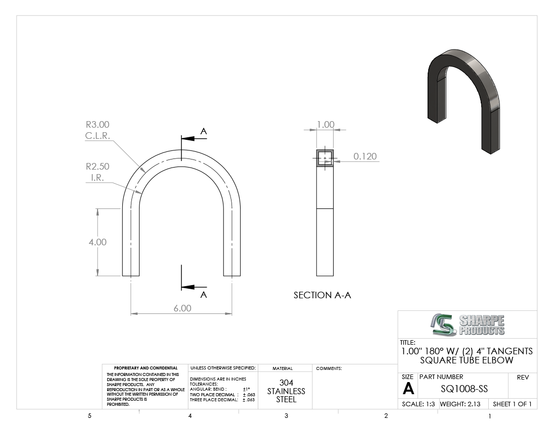 1 SQ. X .120 WALL (11 GAGE) 180° ELL 3 C.L.R. W/ (2) 4 MIN. TANS., S/S 304 **MILL FINISH