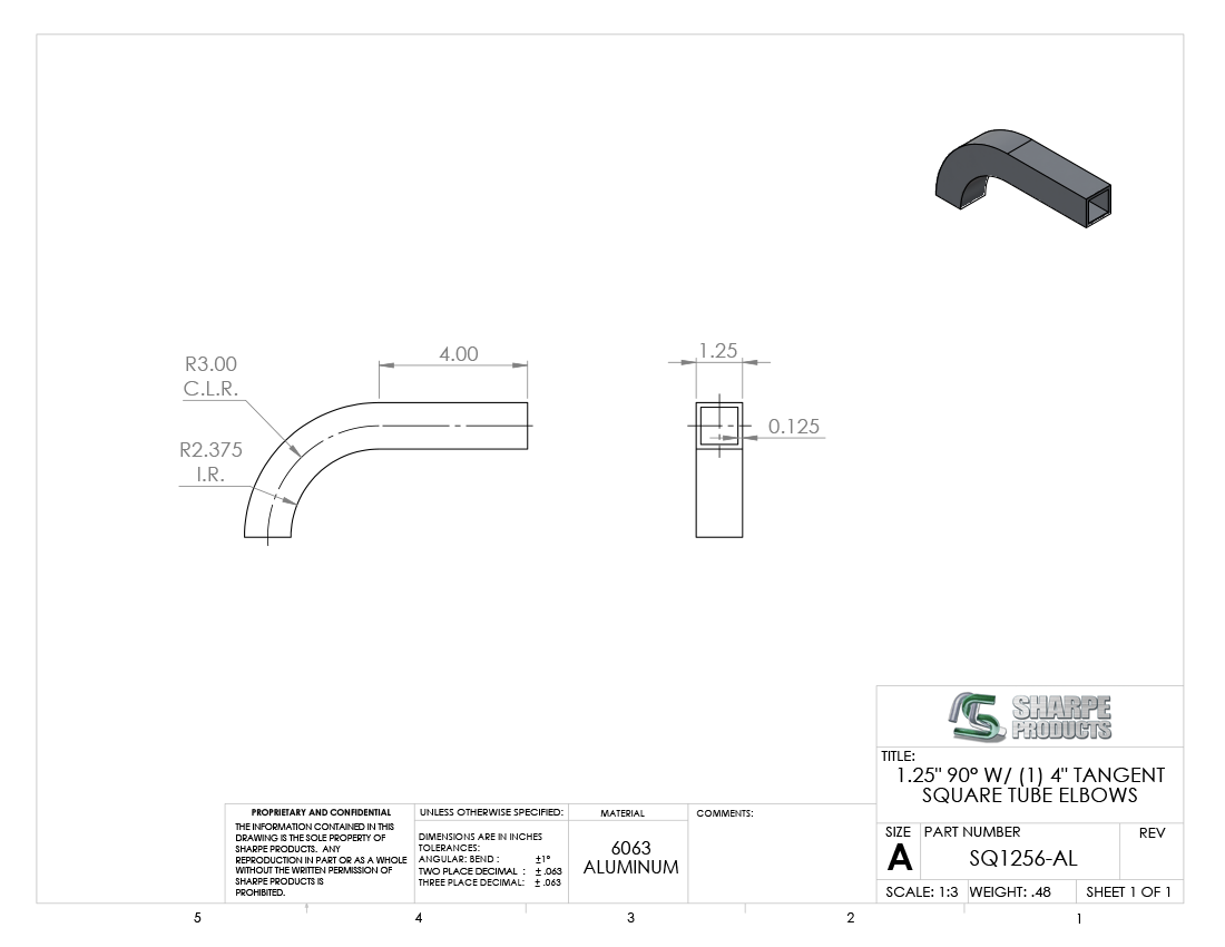 1 1/4 SQ. X .125 WALL 90° ELL 3 C.L.R. W/ (1) 4 MIN. TAN., ALUM 6063 **MILL FINISH