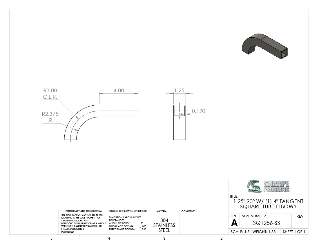 1 1/4 SQ. X .120 WALL (11 GAGE) 90° ELL 3 C.L.R. W/ (1) 4 TAN., S/S 304 **MILL FINISH