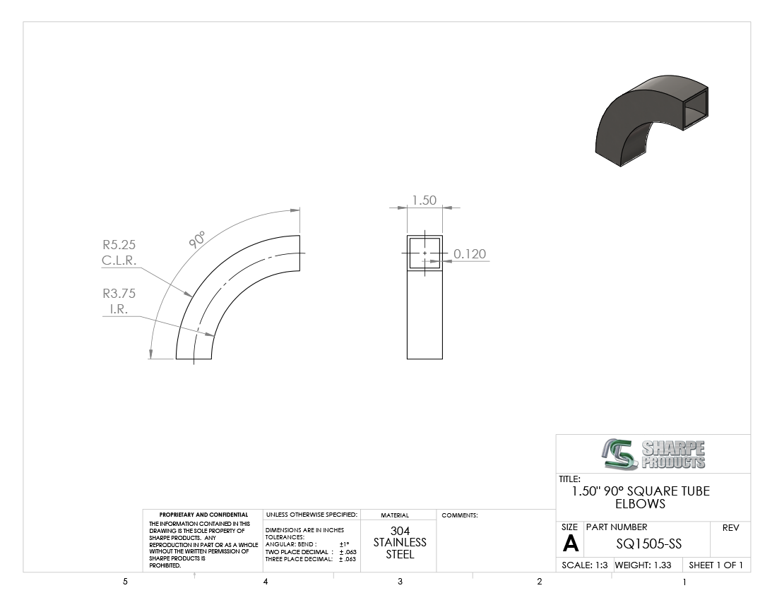 1 1/2 SQ. X .120 WALL (11 GAGE) 90° ELL 4 1/2 C.L.R., S/S 304 **MILL FINISH
